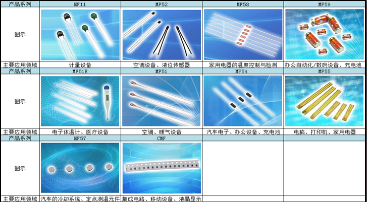 時恒集團的主要測溫型熱敏電阻器名稱、圖面、主要應用領域如下: