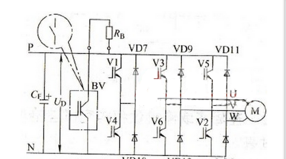 圖中,制動單元BV的作用是:當直流電壓UD超過一定限值時,BV導通,使電容器通過制動電阻RB放電;當直流電壓UD降到限值以內時,BV截止,停止放電。